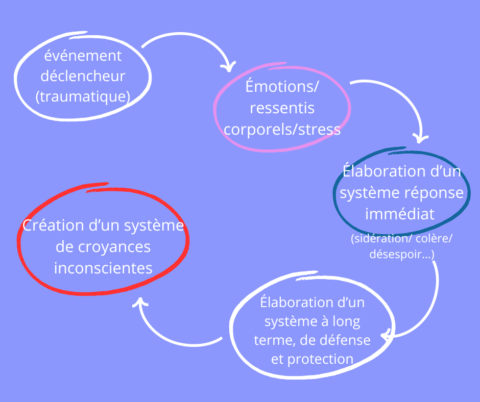 S’il se passe telle chose, les conséquences pour moi sont celles-là. Alors quand je reconnais des circonstances similaires, mon système se remet en état de stress post-traumatique, avant d’arriver à surmonter l’événement et à pacifier son état émotionnel.